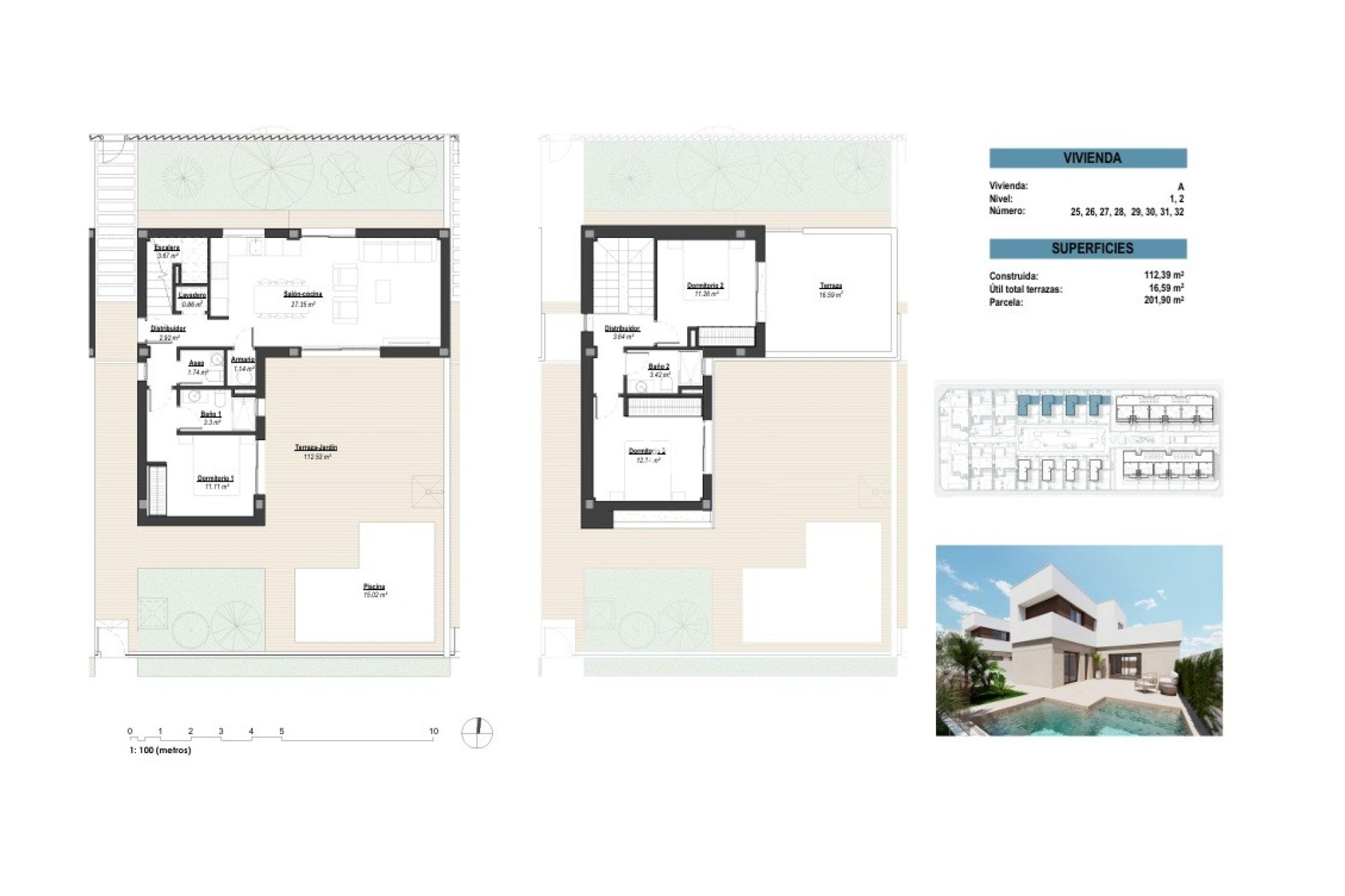 Die Gemeinschaft mit 38 Häusern ist nur 20 Gehminuten von La Serena entfernt und verfügt über einen großen Pool und Gärten sowie eine Photovoltaikanlage zur Umkehrung des Gemeinschaftszählers.