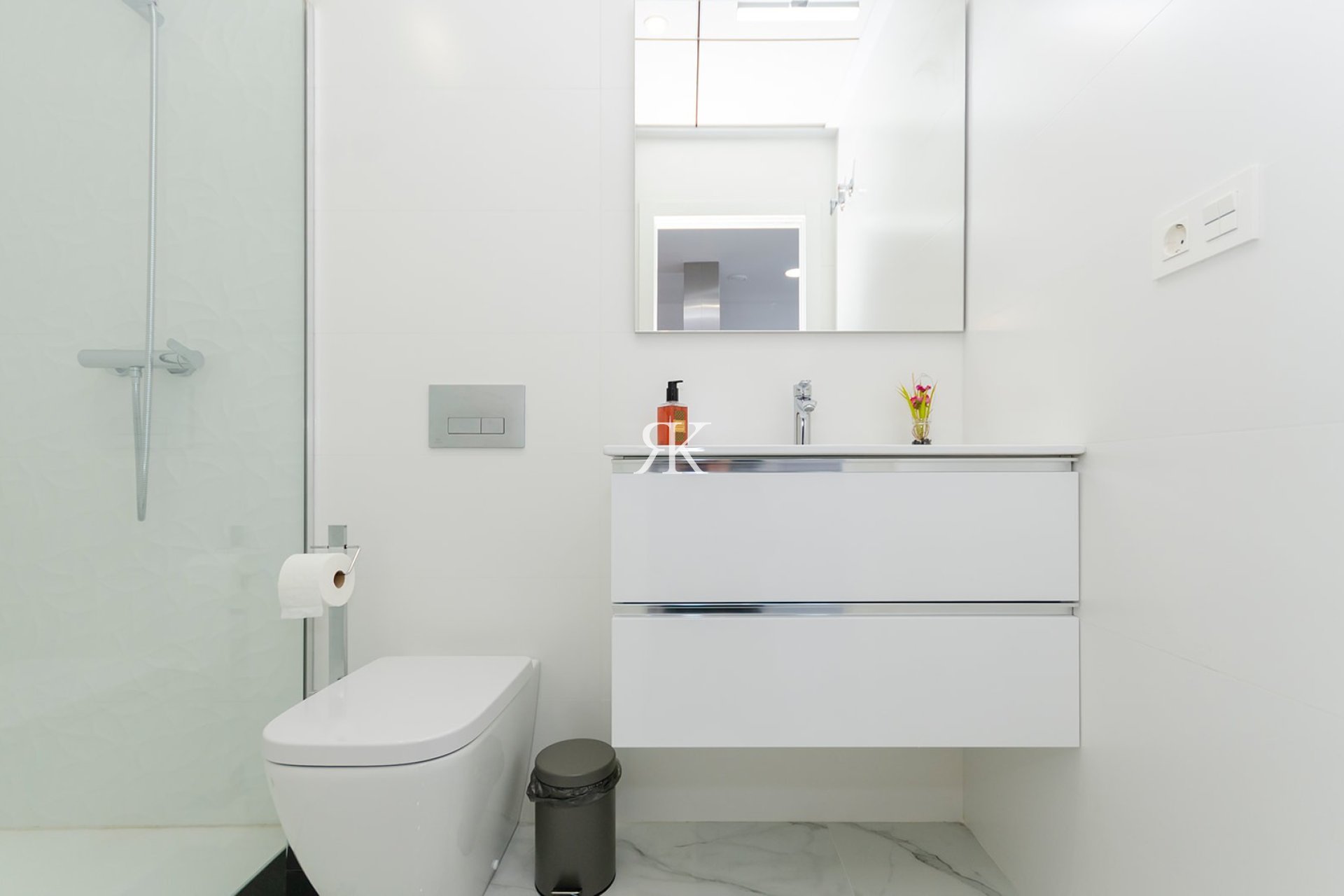 1 Badezimmer mit Dusche, Möbeln mit Spiegel und WC