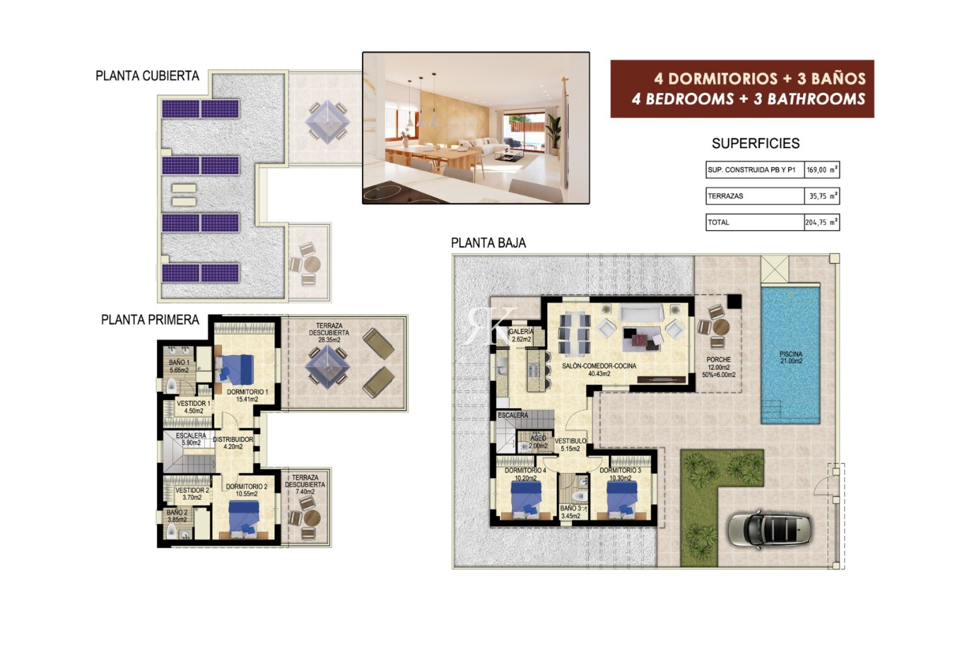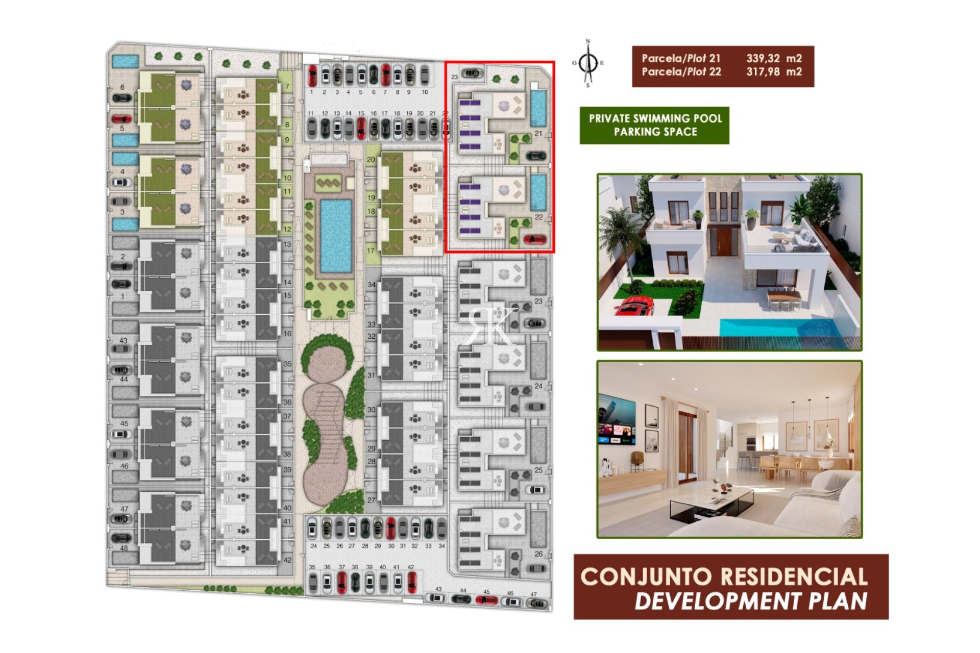 Alle Villen verfügen über: 8 Solaranlagen auf der Dach, 150-Liter-Brauchwassertank, Vorinstallation für Telefon, Internet und Fernsehen in Schlafzimmern und Wohnzimmer, elektrische Jalousien in Wohnzimmer, Schlafzimmern und Küche