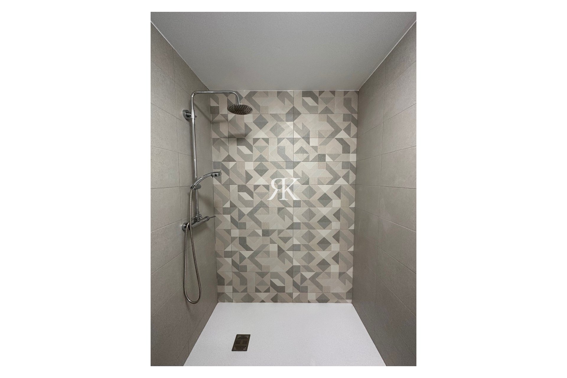 2 Badezimmers mit Dusche, Wandschirm, Möbeln, Spiegel und Toilette