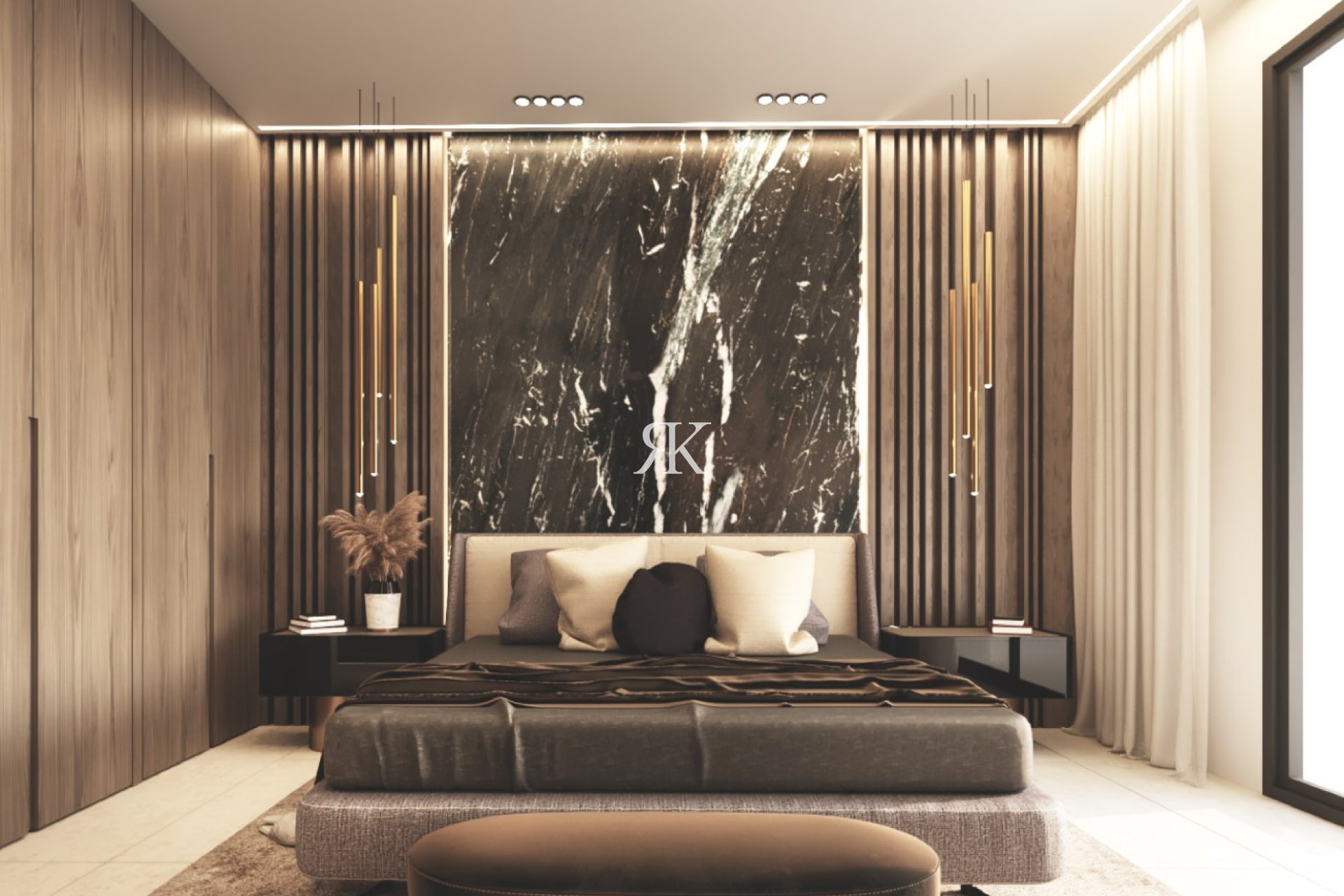 Hauptschlafzimmer mit elektrischen Jalousien, Einbauschränken mit Innenverkleidung, Gepäckfach und Kleiderstange, Hosenablage, Schuhregal, Schmuckschrank und LED-Innenbeleuchtung mit Öffnungssensor. En-Suite-Badezimmer mit Doppeldusche, Duschwand, Möbeln mit integriertem LED-Spiegel und WC.