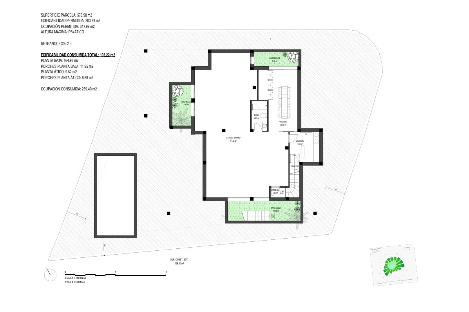 - Fertiger Keller (164,30 m²), zugänglich über eine Innentreppe, mit drei englischen Terrassen (8,45 m², 7,88 m² und 14,56 m²). Abstellraum, Waschküche und Technikraum. Beleuchtung. Wasseranschluss, Stromanschlüsse und Vorinstallation für Klimaanlage.