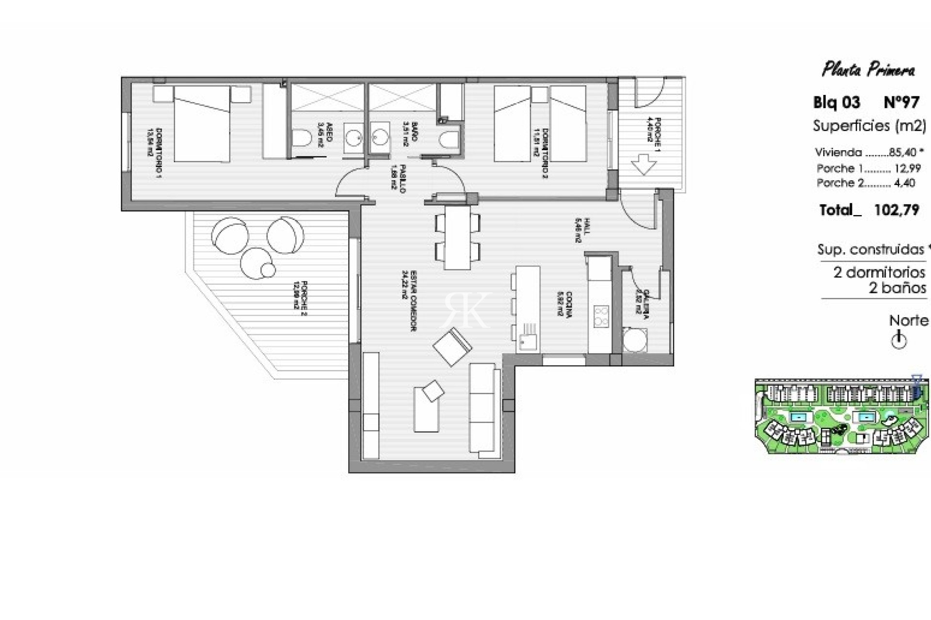 Ein geschlossener Komplex aus drei 5-stöckigen Blöcken und zwei 3-stöckigen Blöcken, die alle nach Süden ausgerichtet sind und eine große Grünfläche mit Spielplatz, Minigolf, Petanque, Tischtennisplatte, Fitnessstudio und Spa umgeben.