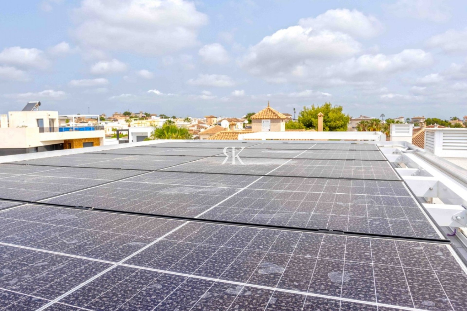 Luxus trifft auf Nachhaltigkeit. Die Dachterrasse verfügt über eine Außenküche, eine großzügige Pergola mit horizontalen und vertikalen Sonnenschirmen und 4100-Watt-Solaranlagen für Ihren Energiebedarf. Eine Waschmaschine und ein Kühl-Gefrierschrank sind ebenfalls praktisch auf der Terrasse untergebracht.