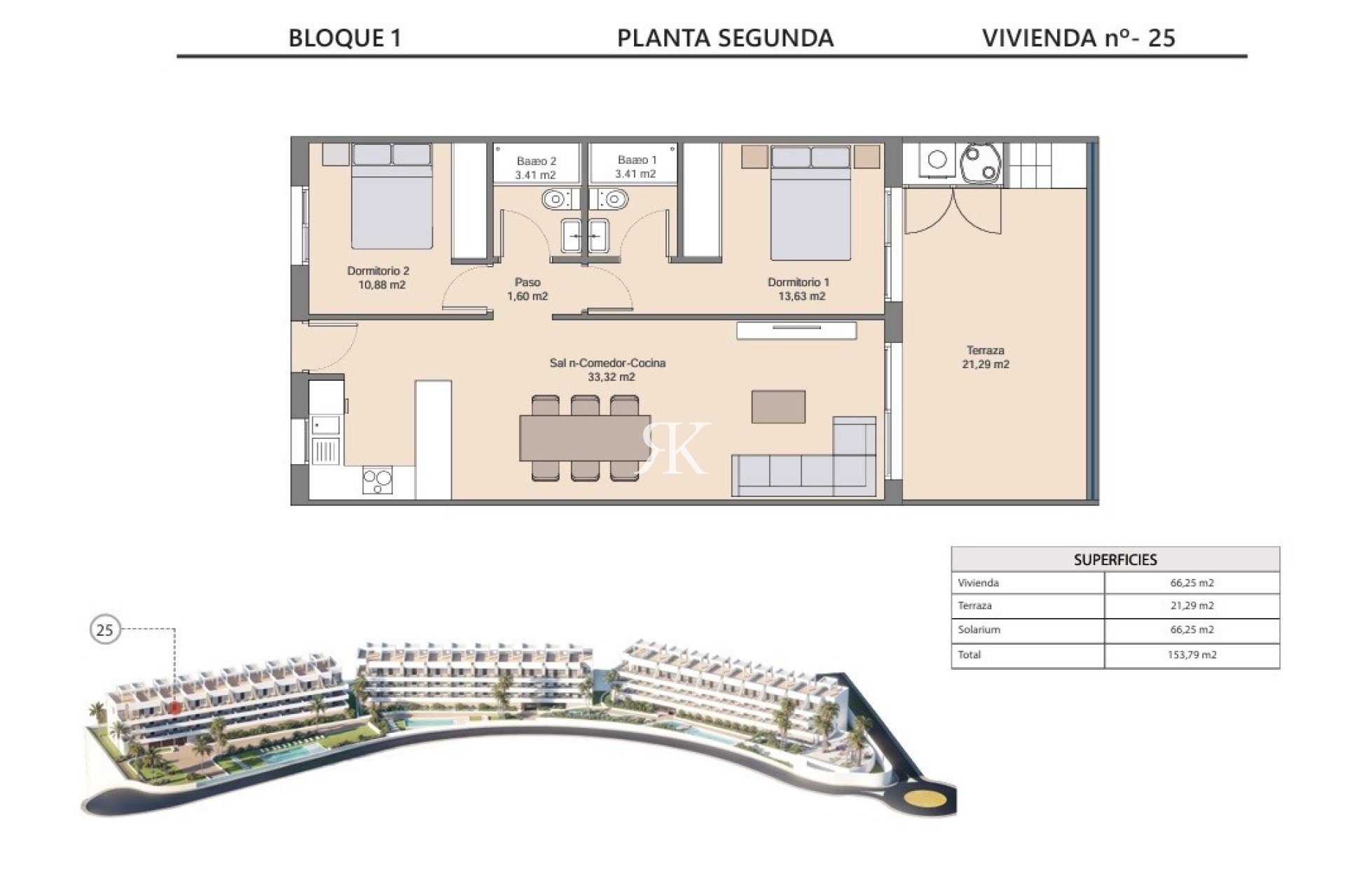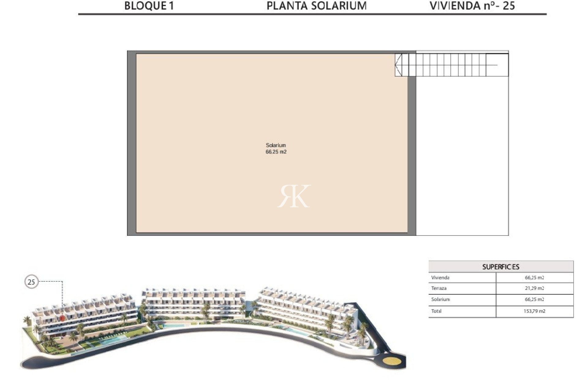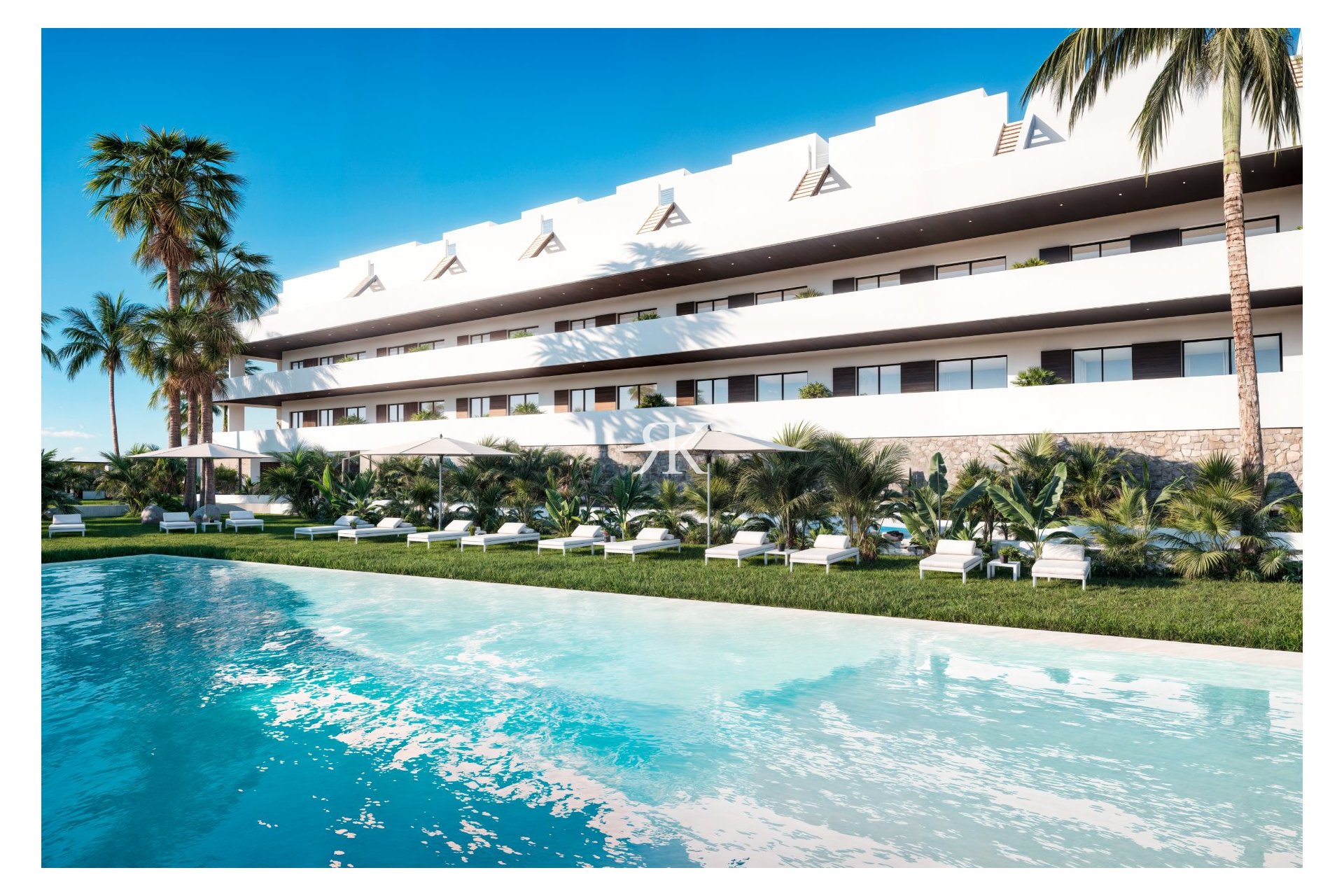 All apartments have: Pre-Installation Air-conditioning, Domestic hot water via an aerothermal system,video intercom that will connect you to the entrances and access to the development.Security blinds,Telecommunications installation with RJ45 sockets, TV in the living room and bedroom
