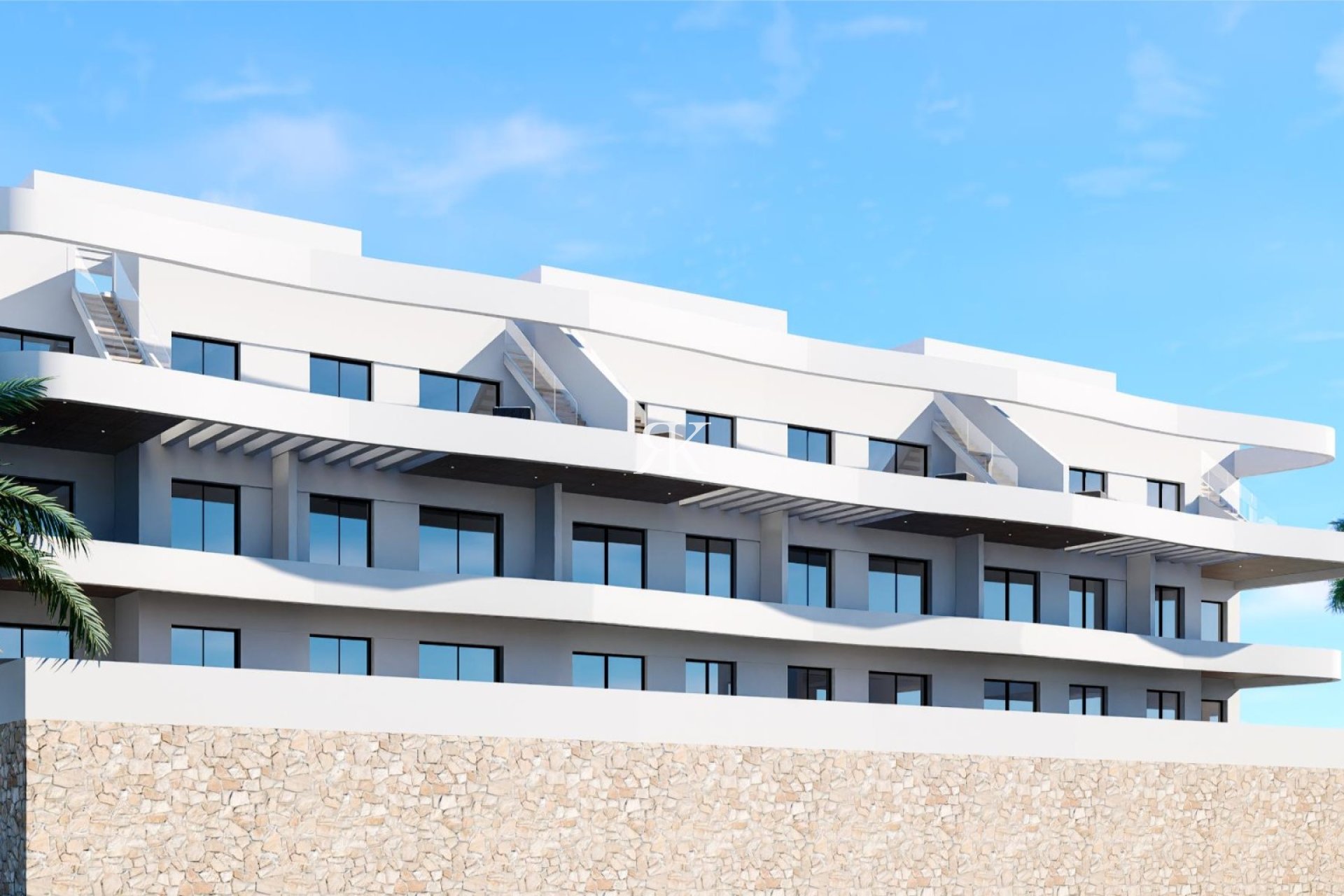 All apartments have: Air conditioning system (hot/cold) through ducts, with exhaust grilles in the living room and bedrooms. Temperature control located in the living room. Double glazing with Roller shutters. All terraces are equipped with a water supply and a water evacuation system. They will also include lighting and a power outlet.