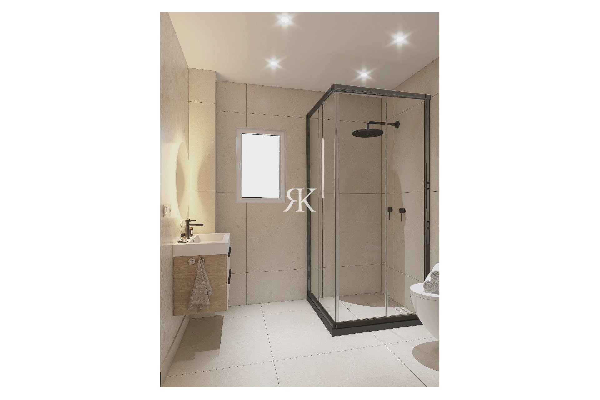 Une chambre principale avec placards intégrés et salle de bain attenante avec douche, meubles et toilettes