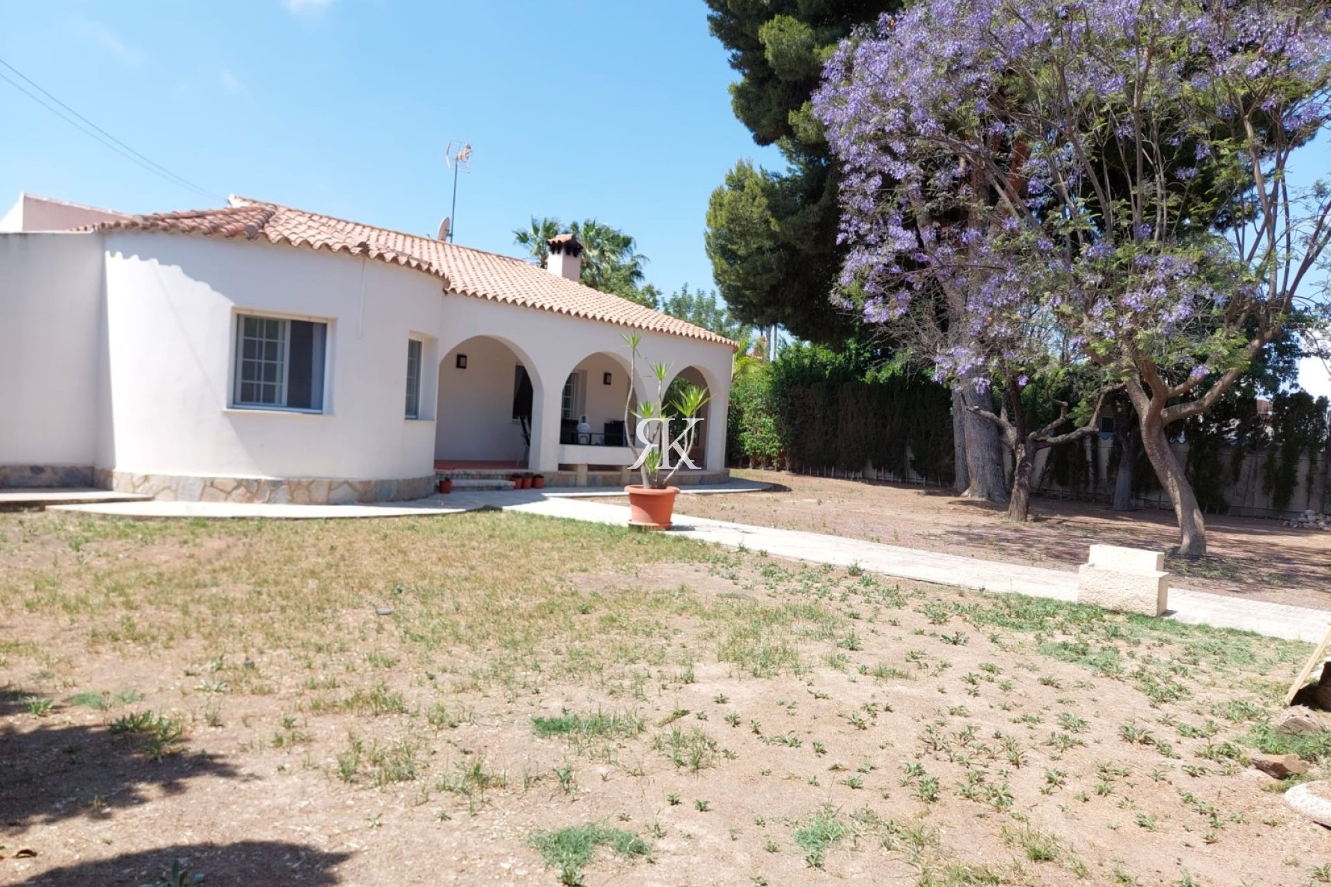 un grand jardin avec système d'irrigation, planté de pins, d'amandiers et de cyprès centenaires