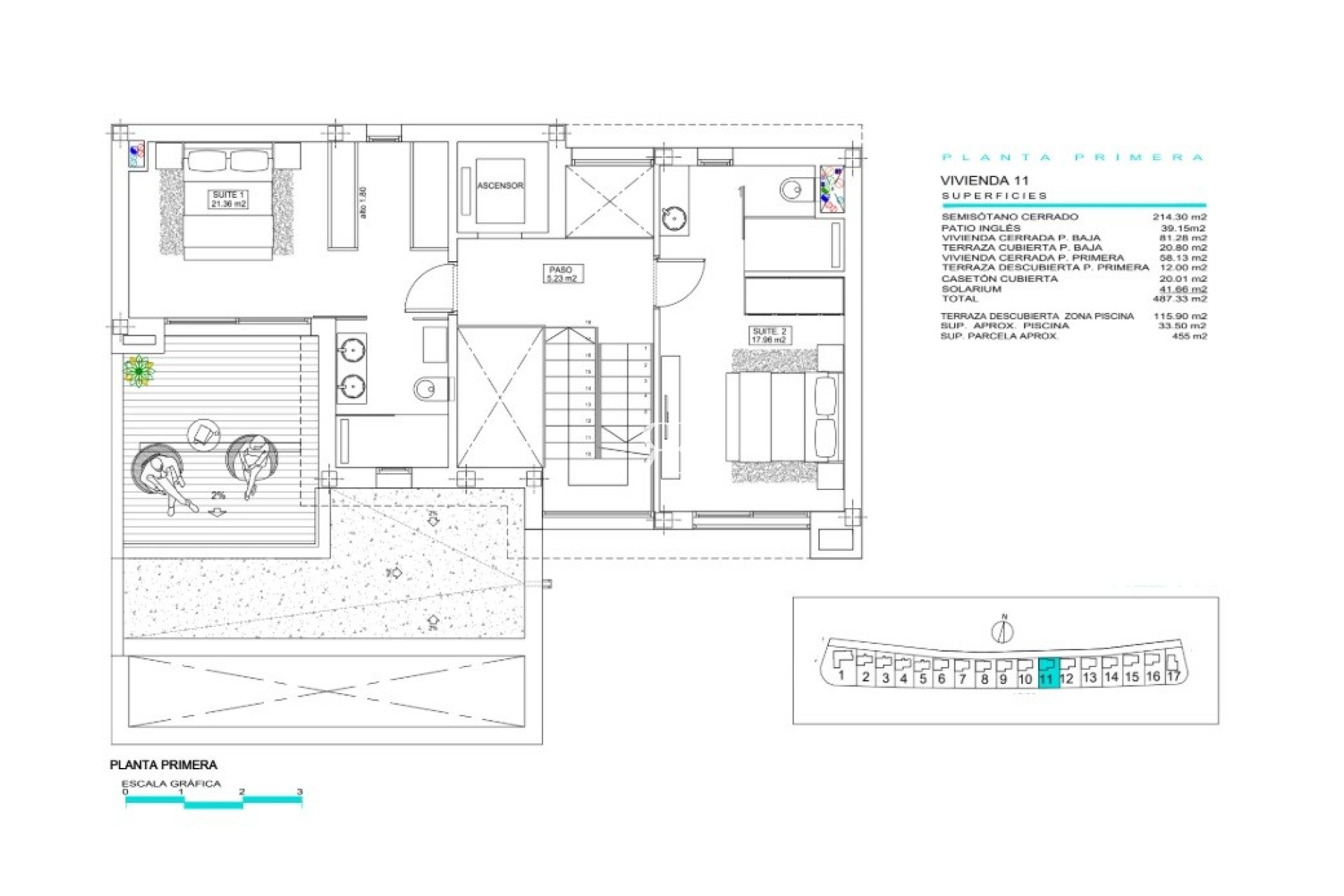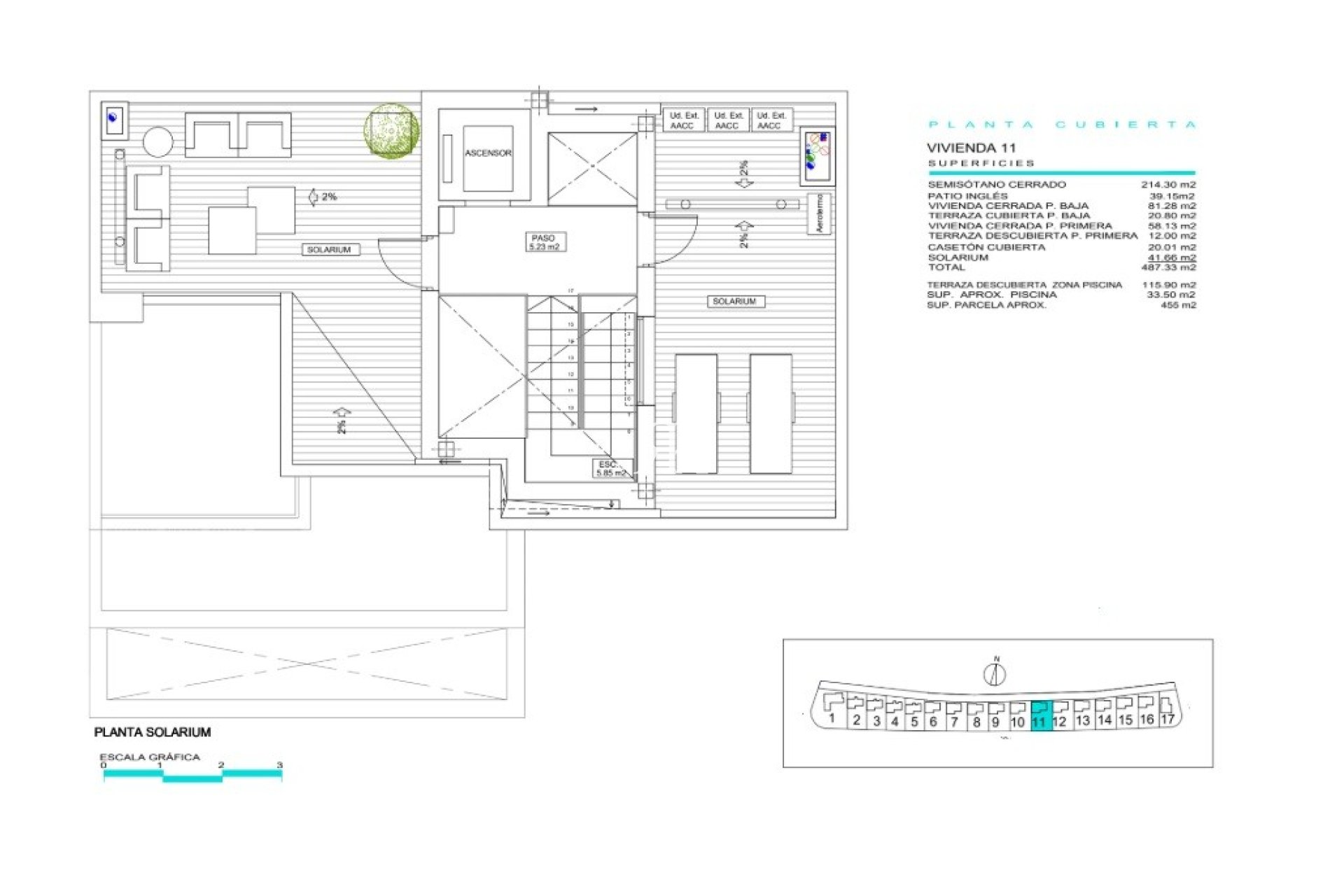 - Solarium divisé en deux parties (séparées par l'ascenseur, un escalier intérieur et une passerelle)