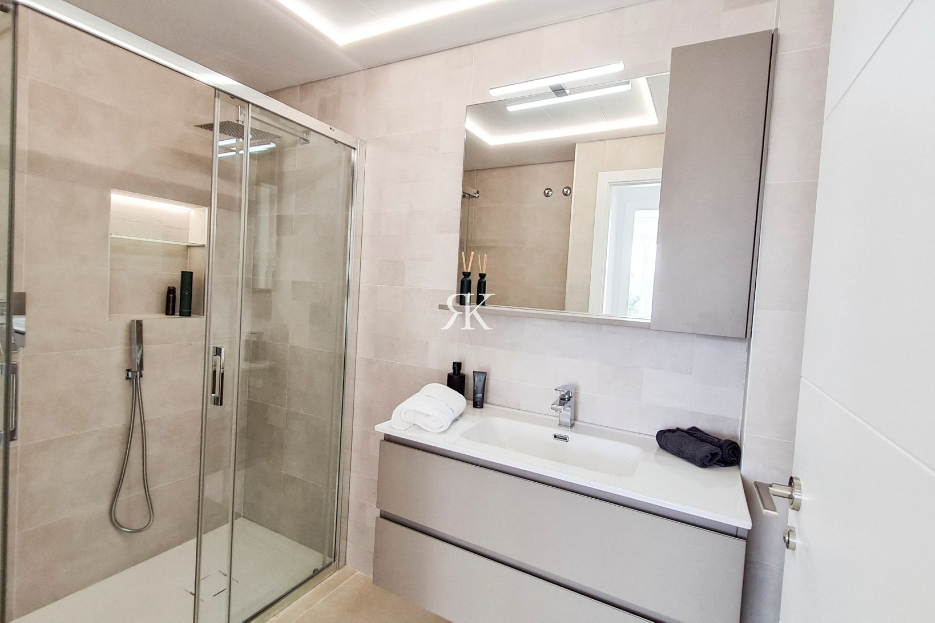 1 salle de bain avec double douche, meubles, toilettes, miroirs avec éclairage LED, étagère décorative avec éclairage LED et sèche-serviettes électrique.
