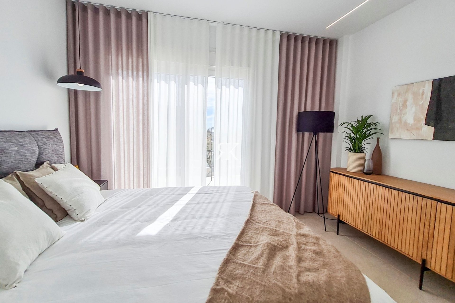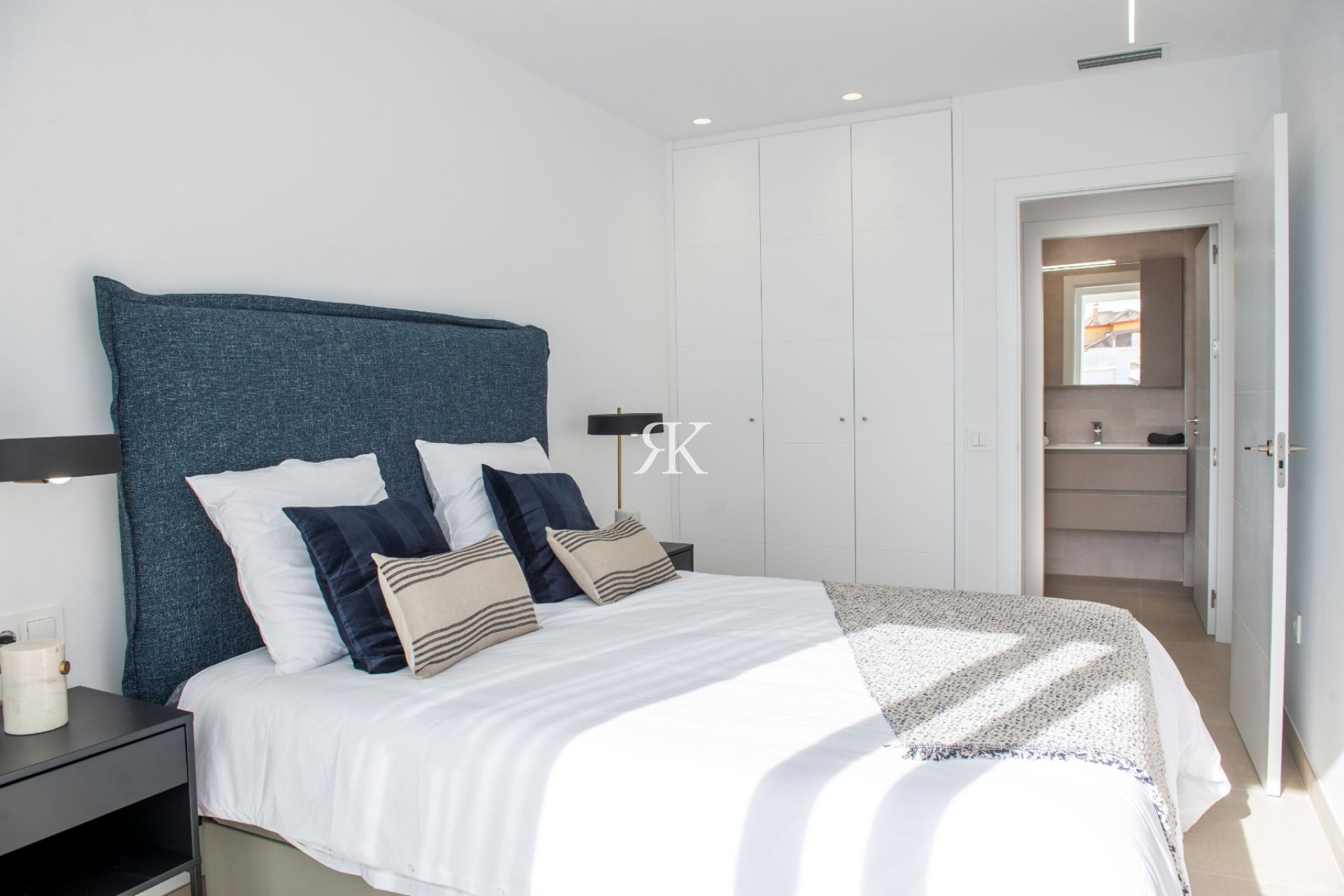 Chambre principale et dressing avec placards intégrés avec tiroirs, étagère et tringle, porte-pantalons coulissant et miroir. Éclairage LED intégré avec détecteur d'ouverture et sèche-serviettes électrique.