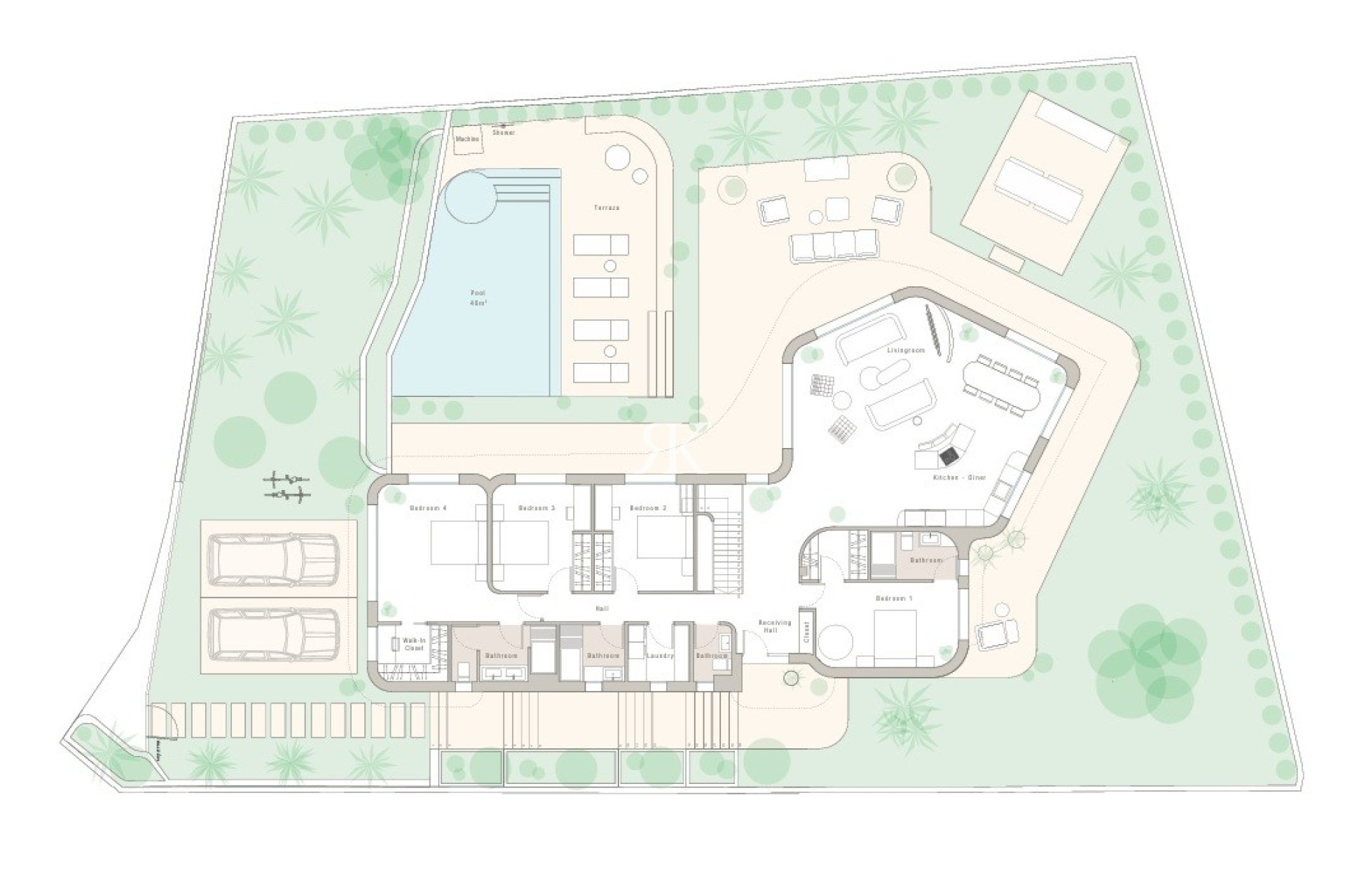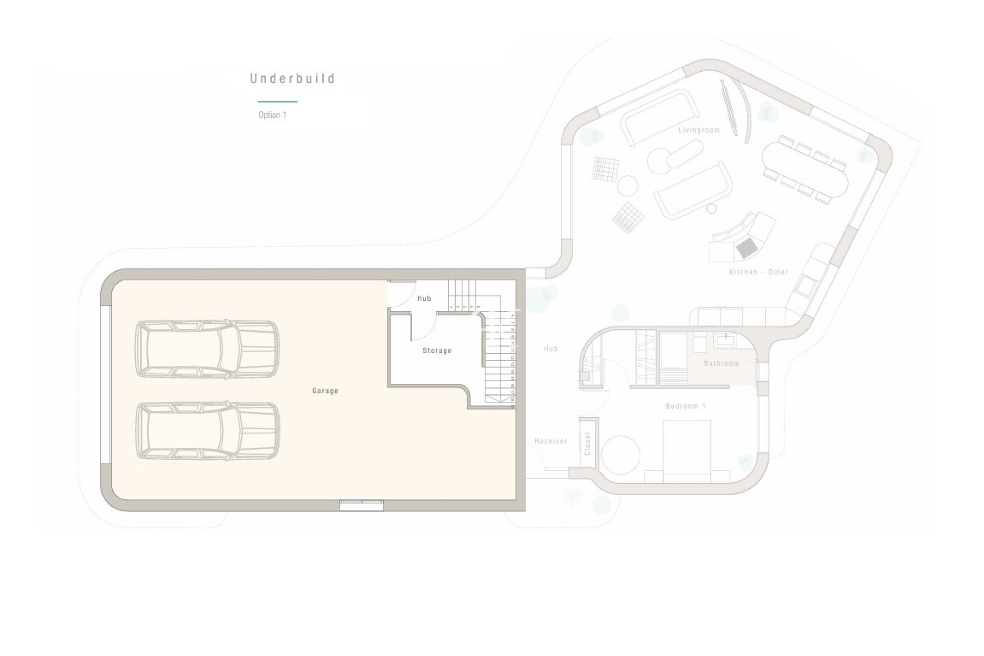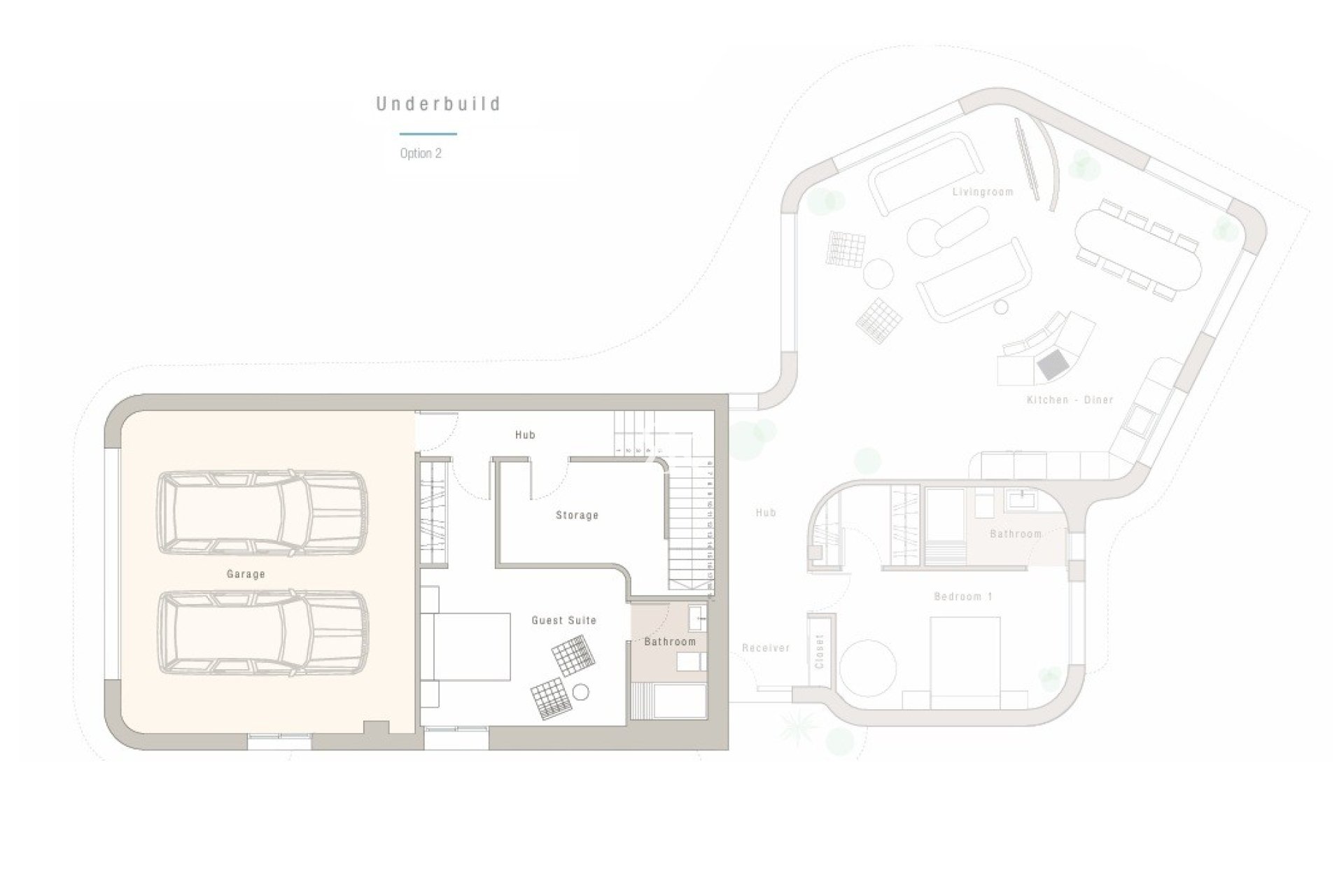 2/ Parking pour 2 voitures avec pré-installation pour borne de recharge pour véhicules électriques. Un débarras et une suite d'invités avec salle de bain.
