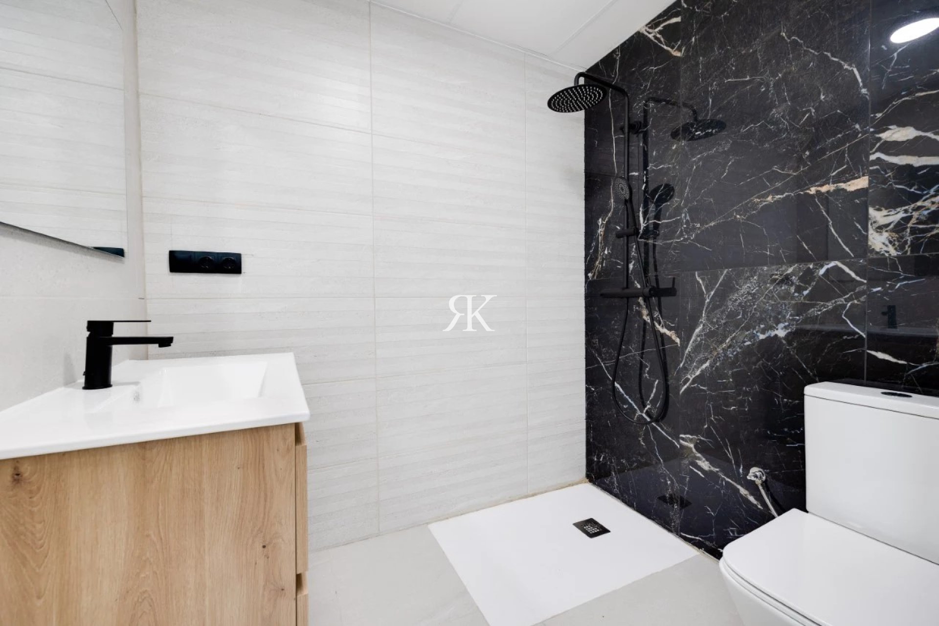 3 salles de bains avec douche, meubles et toilettes.