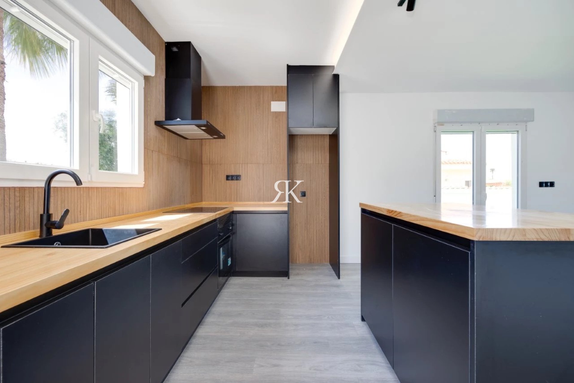 Spacieux salon/salle à manger ouvert. Cuisine équipée d'un îlot central moderne et d'électroménagers intégrés.