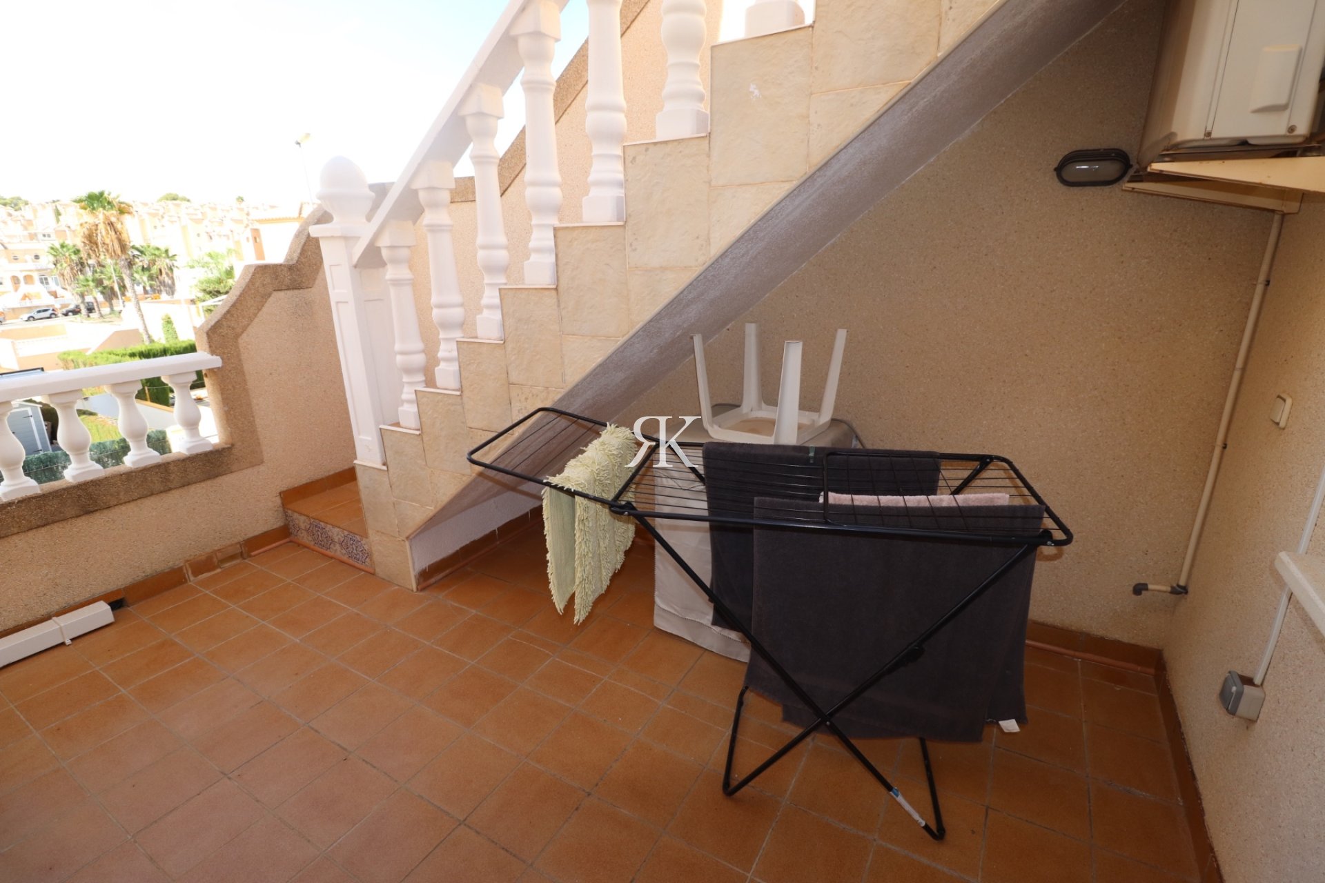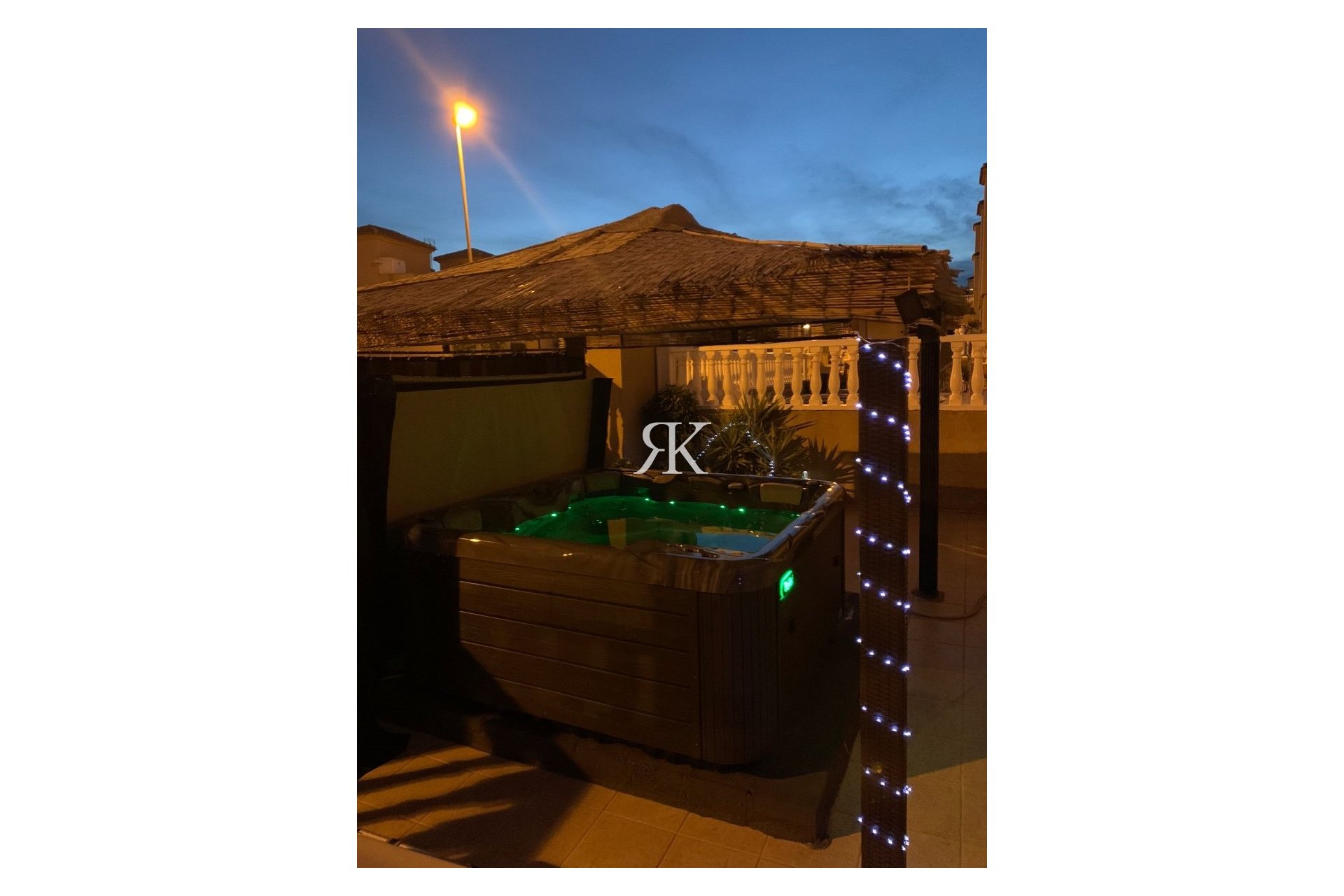 Une terrasse mène au solarium, où se trouve également un espace de rangement. L’extérieur est très agréable avec plusieurs terrasses, dont une couverte, un jacuzzi, une place de parking et un débarras.