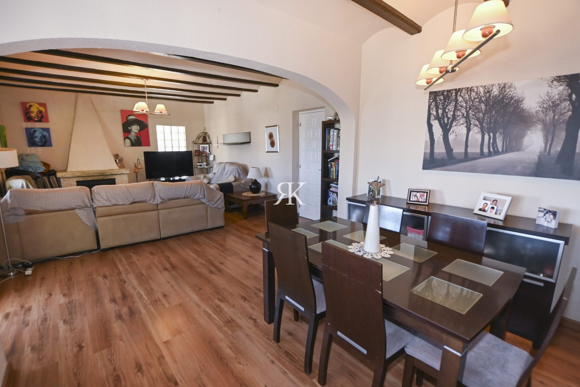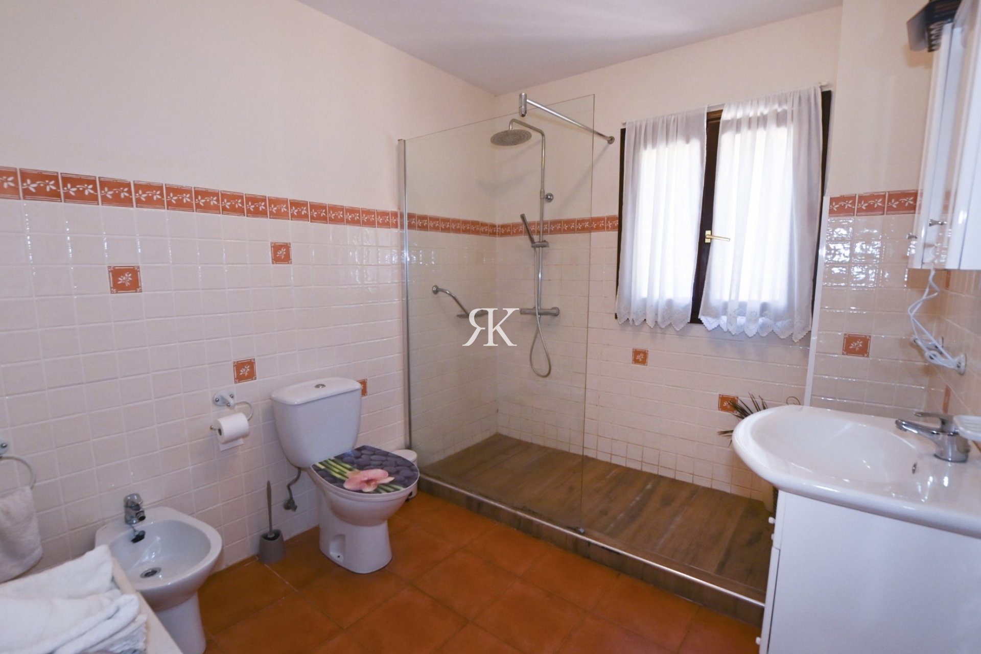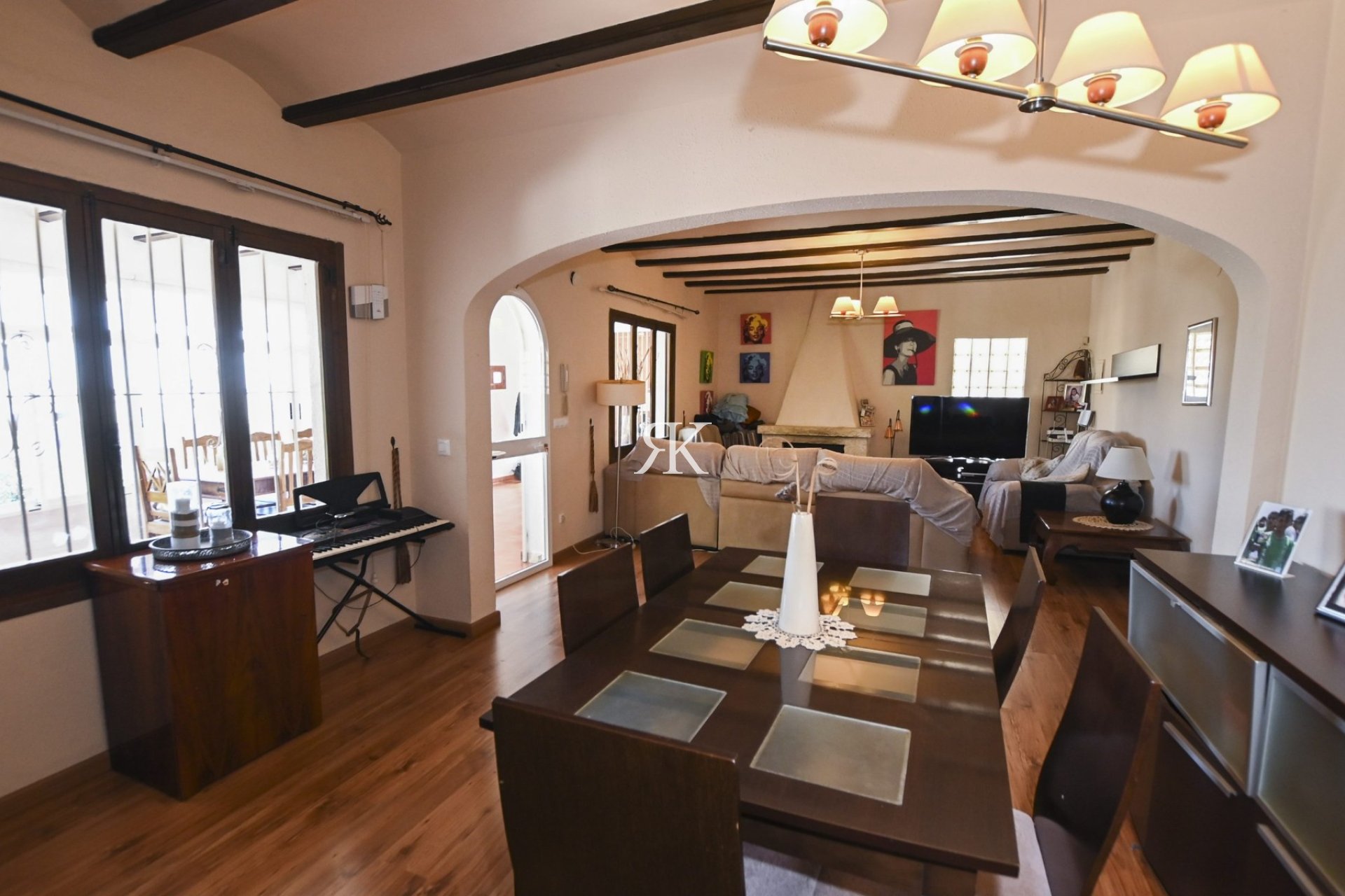 Een enorm glazen terras dat de helft van de voorkant van de villa beslaat en leidt naar een ruim open terras aan de zijkant. Open woon- en eetkamer met pelletkachel en airconditioning.