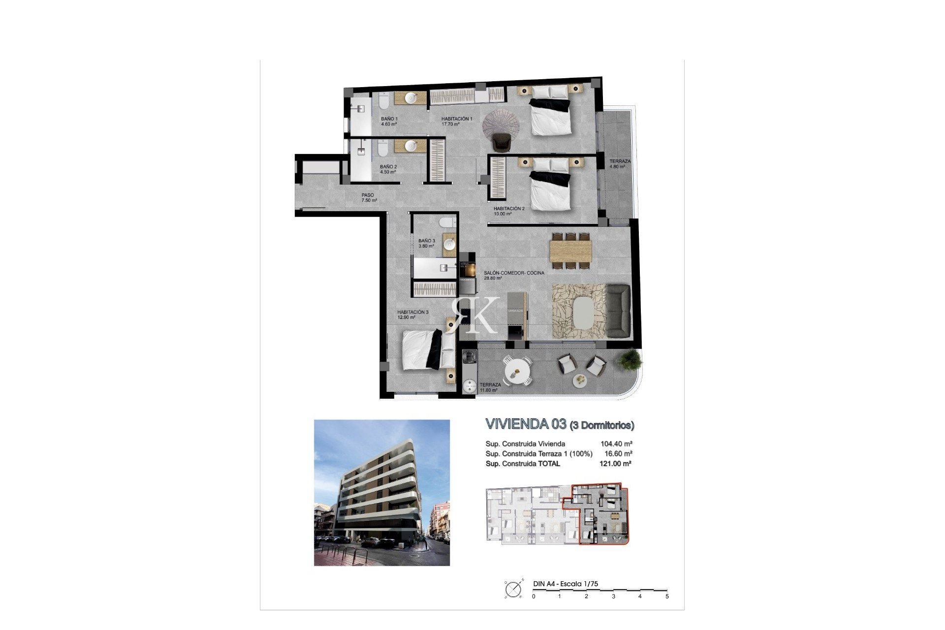 3 slaapkamers met inbouwkast en gemotoriseerde aluminium rolluiken.
