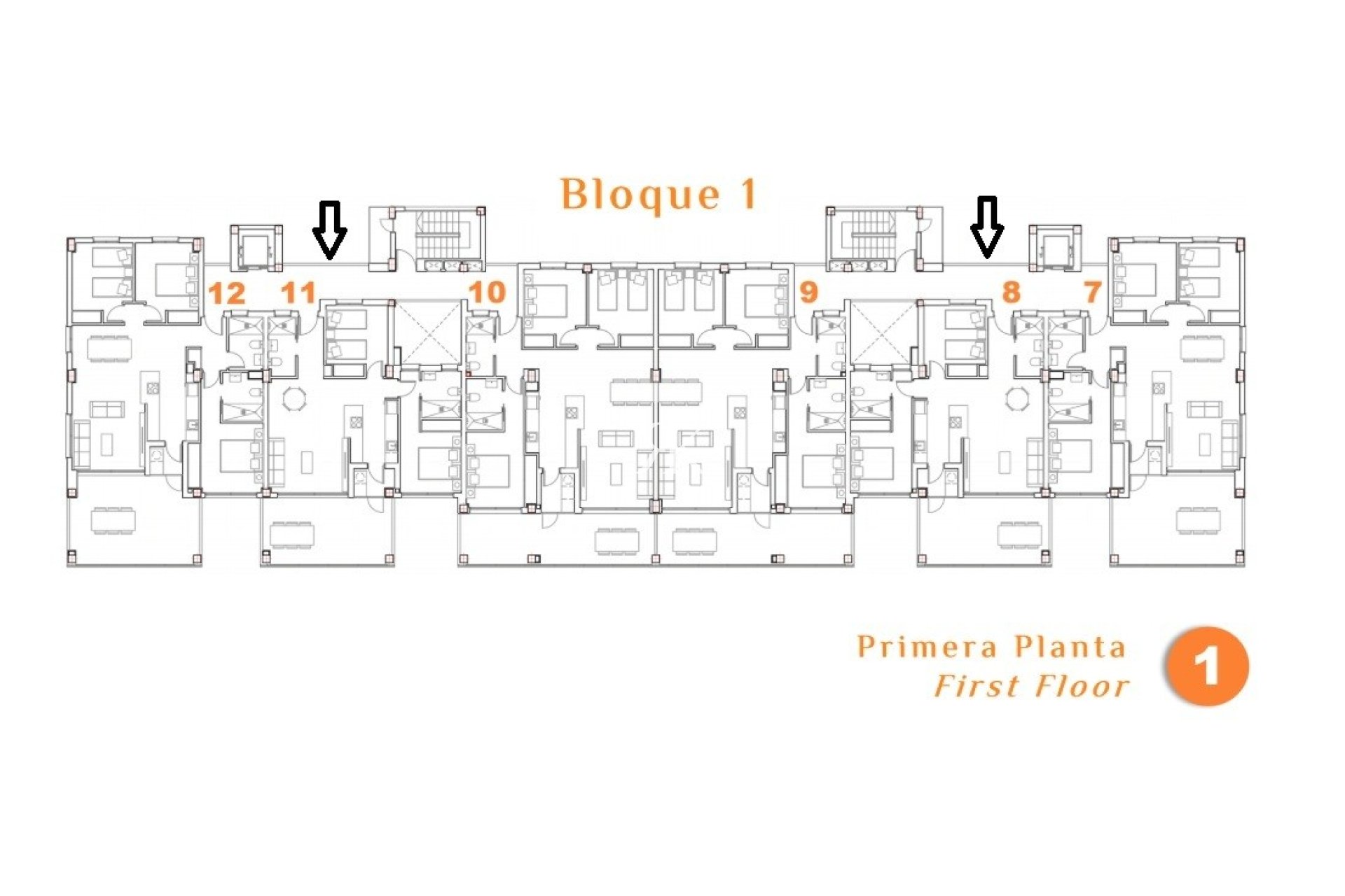 Bloque 1 de 5 bloques de 222 apartamentos en total, rodeando un gran jardín central en 3 niveles y con 3 piscinas comunitarias. Estacionamiento subterráneo y trastero