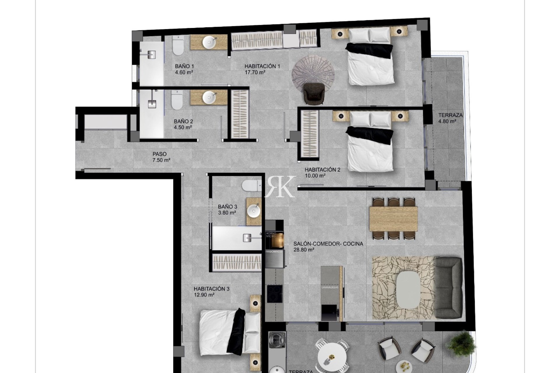 - Suelo radiante en baños. - Domótica. - Climatización con bomba de calor mediante sistema de aerotermia. - Sistema Airzone. - Grifería termostática de ducha. - Electrodomésticos Balay. Opción de integrar lavavajillas y frigorífico. - Mueble de baño de alta gama. - Isla de cocina con mueble de TV integrado.