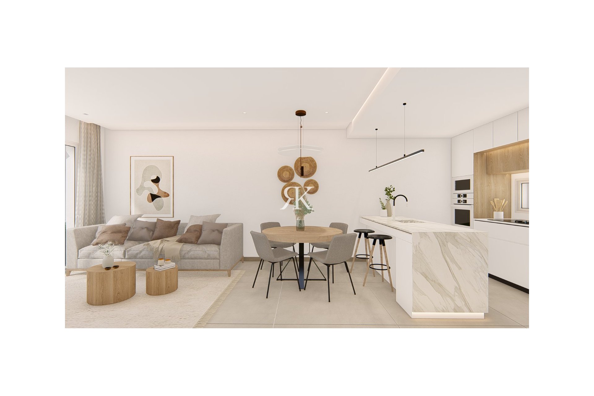 Salón y cocina de concepto abierto equipados con Frigorífico Combi Integrado, Placa de inducción en cristal blanco, Horno eléctrico, Campana integrada, Microondas integrado en cristal blanco, Lavavajillas y Lavadora integrados
